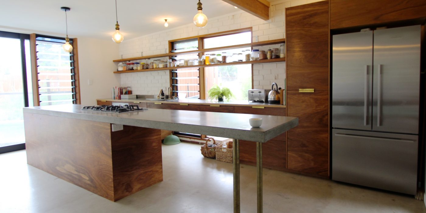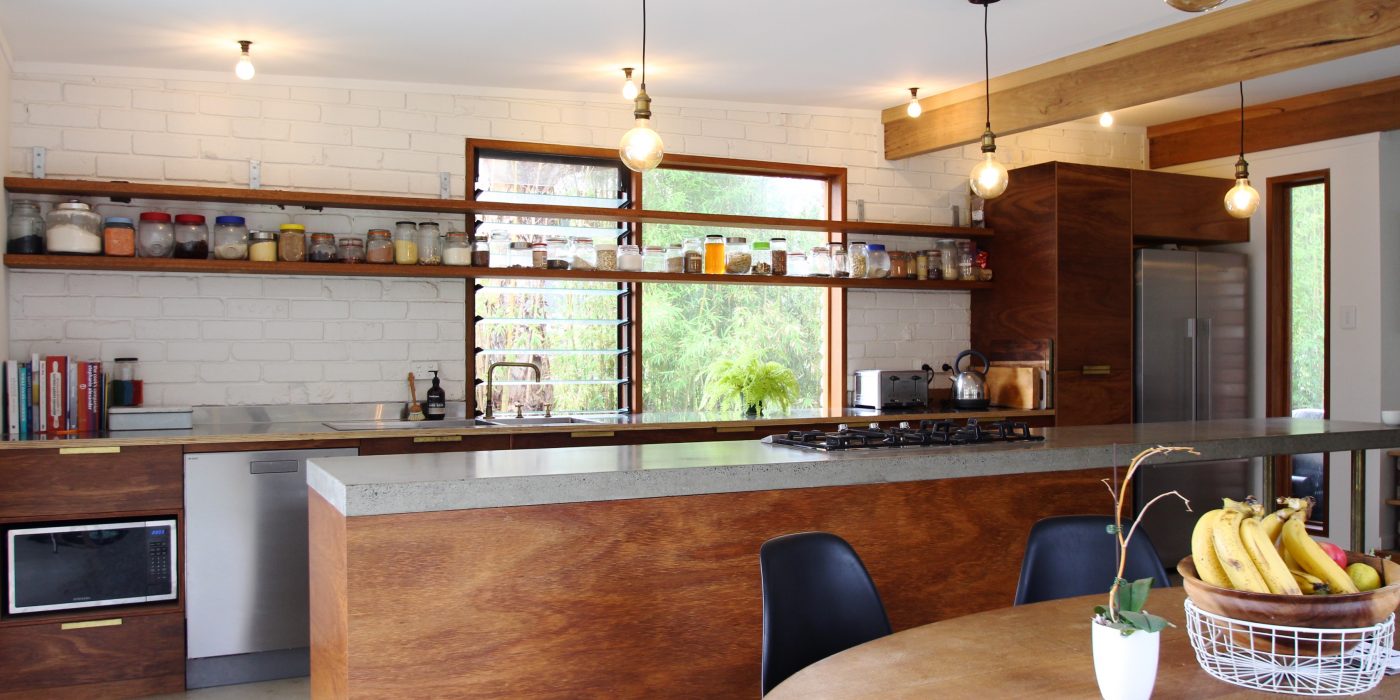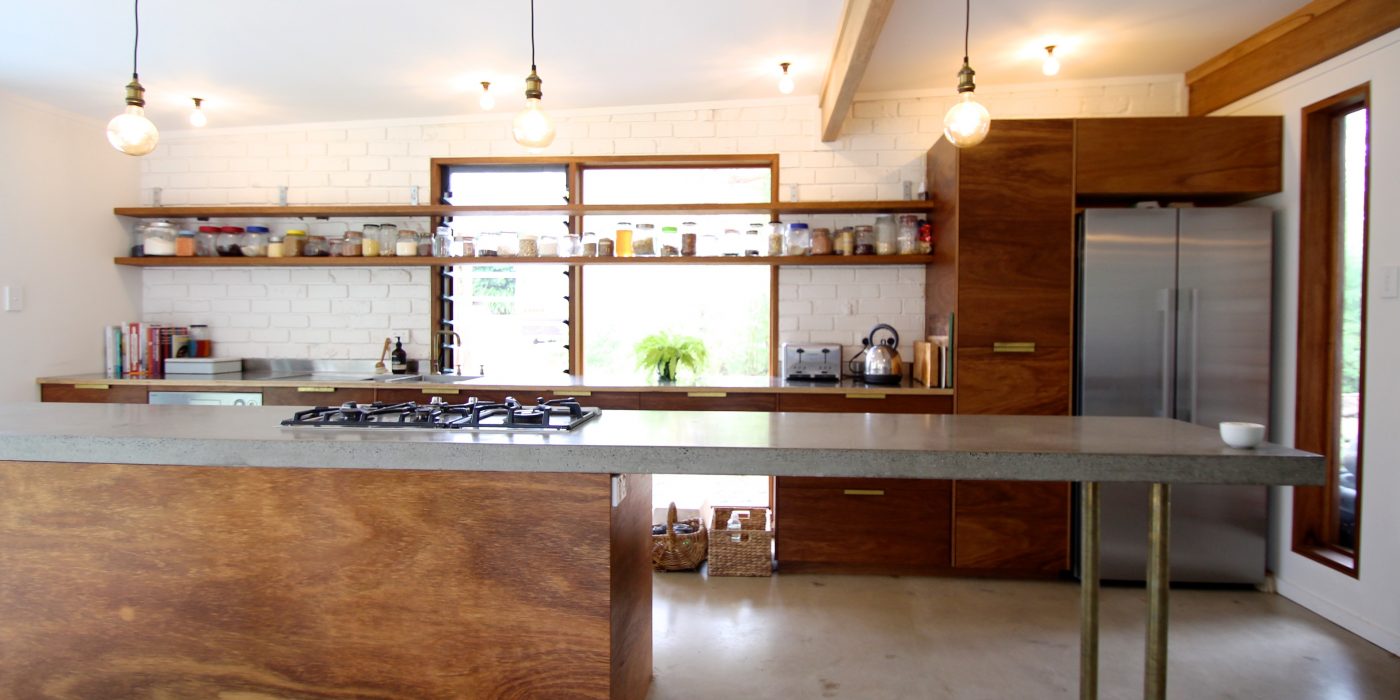 Original elements of brick, timber and concrete have been used as a corner post for the homely yet industrial feel of this unique home. This renovation is the perfect blend of embracing the old and integrating the new. The open shelving, brass hardware and tapware as well as the use of Edison globes compliments the home’s earthy elements perfectly.
