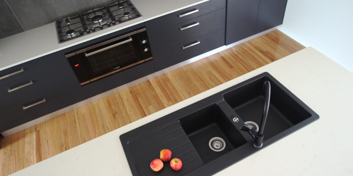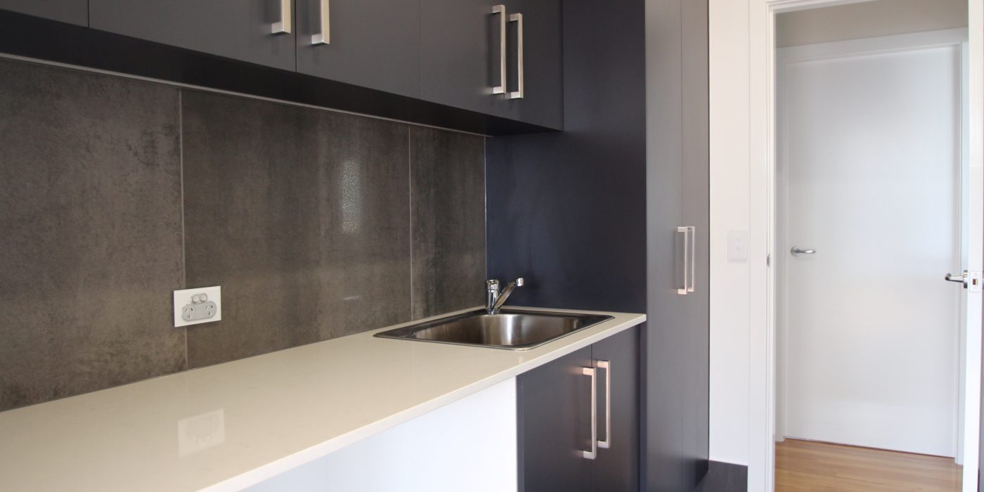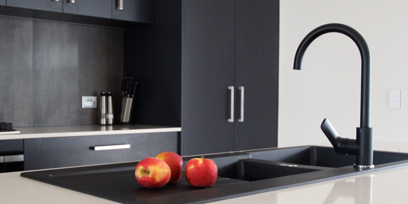 After years of seeing clean white kitchens many people are now being drawn to the stricking impact of black! Coupled with white bench tops this contrast intentionally amplifies the symmetrical design and draws your attention to the black sink and tapware. Sitting in the centre of this modern home the bold colour choices are continued into the laundry and provide a backdrop that will enhance the appeal to any coloured furnishings one might like to add.