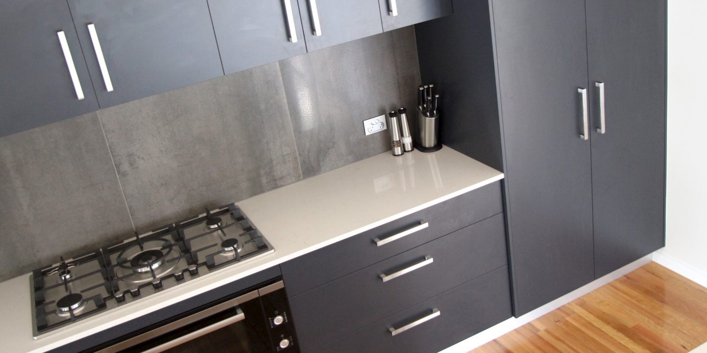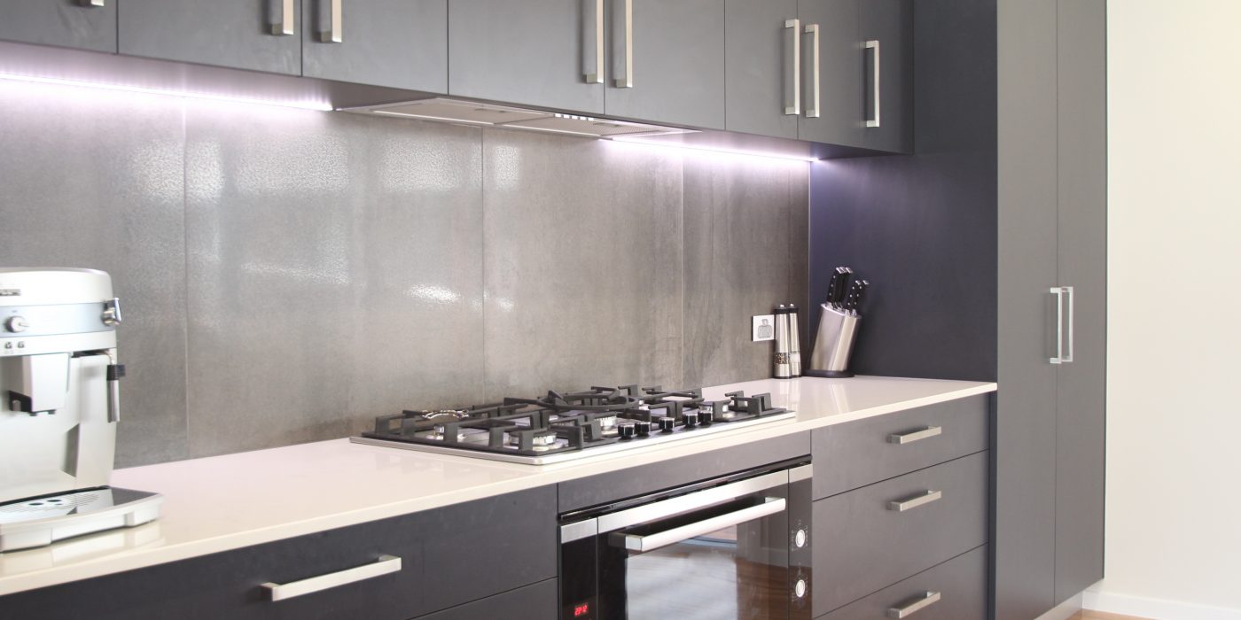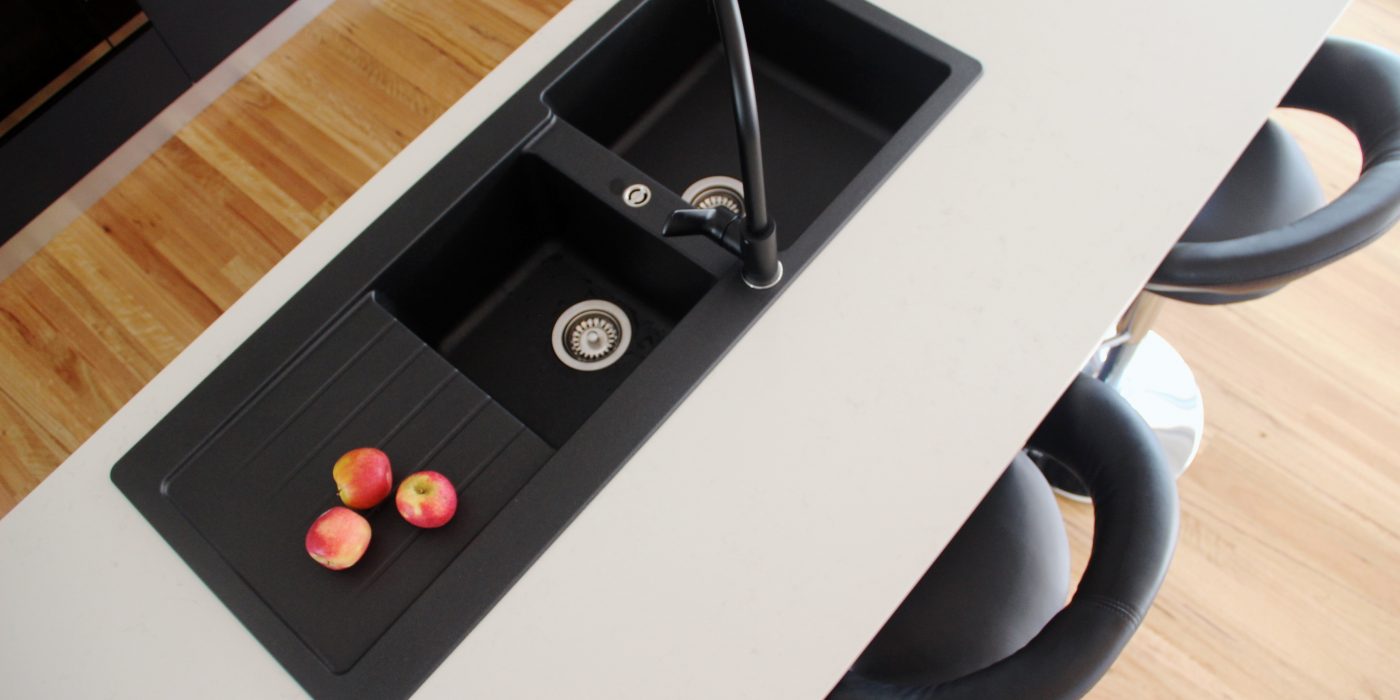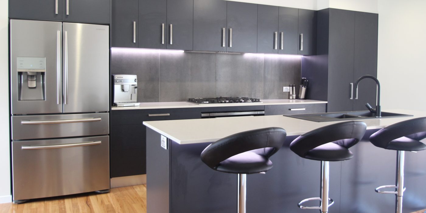 After years of seeing clean white kitchens many people are now being drawn to the stricking impact of black! Coupled with white bench tops this contrast intentionally amplifies the symmetrical design and draws your attention to the black sink and tapware. Sitting in the centre of this modern home the bold colour choices are continued into the laundry and provide a backdrop that will enhance the appeal to any coloured furnishings one might like to add.