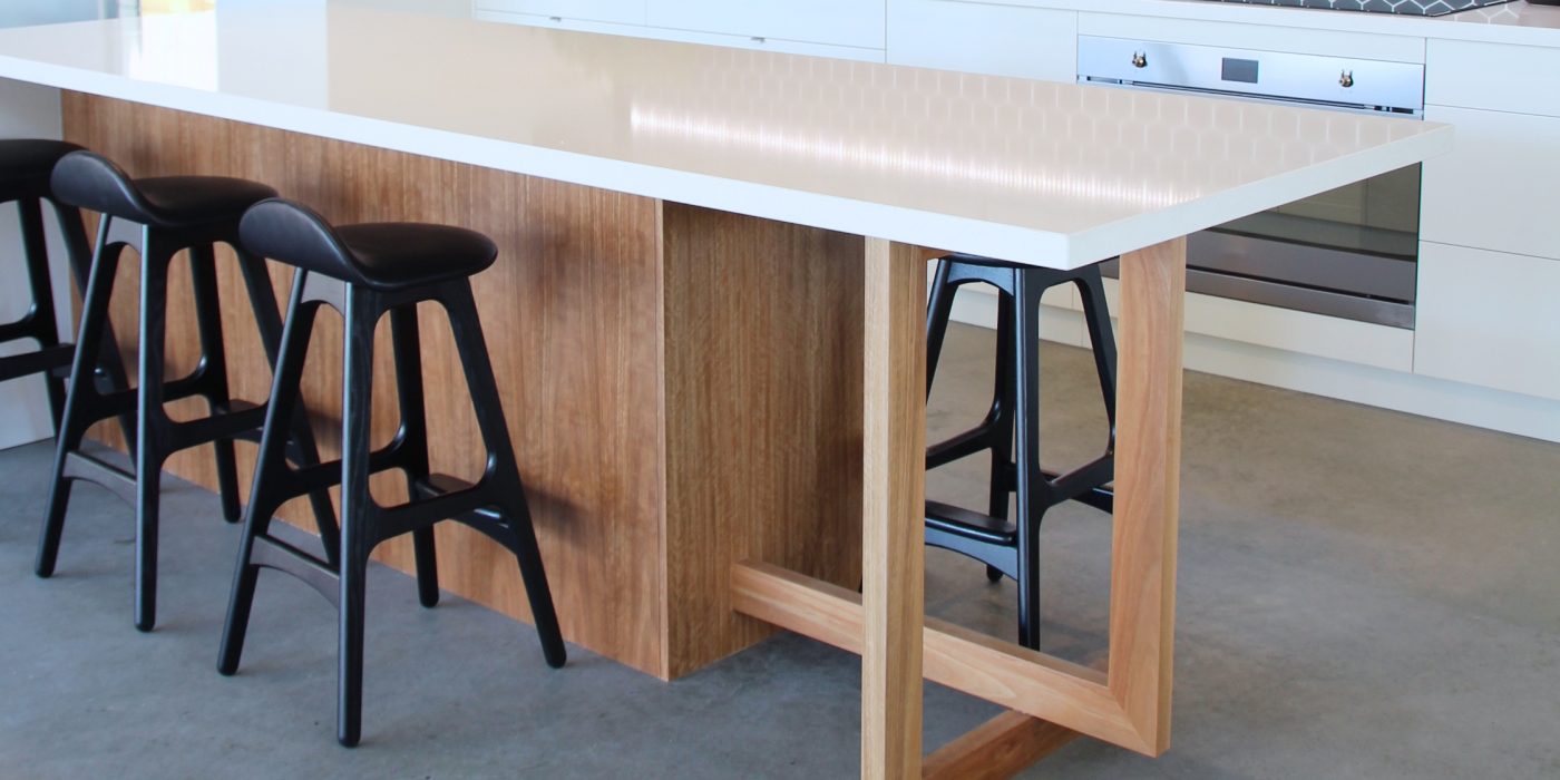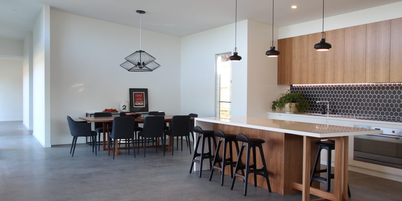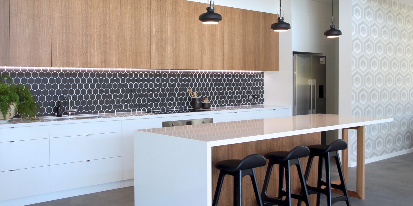 This Stunning kitchen blends clean contemporary lines with a mix of natural elements and a hint of a rustic, industrial edge. This fine balance creates a timeless warmth within a modern home. The use of whites in the benchtop and cabinetry compliments the clean, seamless lines of the design and allows the timber work, burnished concrete and splashes of black to shine. The unique shape of the island bench has been designed to reflect the carefully chosen furniture pieces. It’s this fluidity between elements that demonstrates the collaboration of teams involved in this project and the results are a credit to them all.
