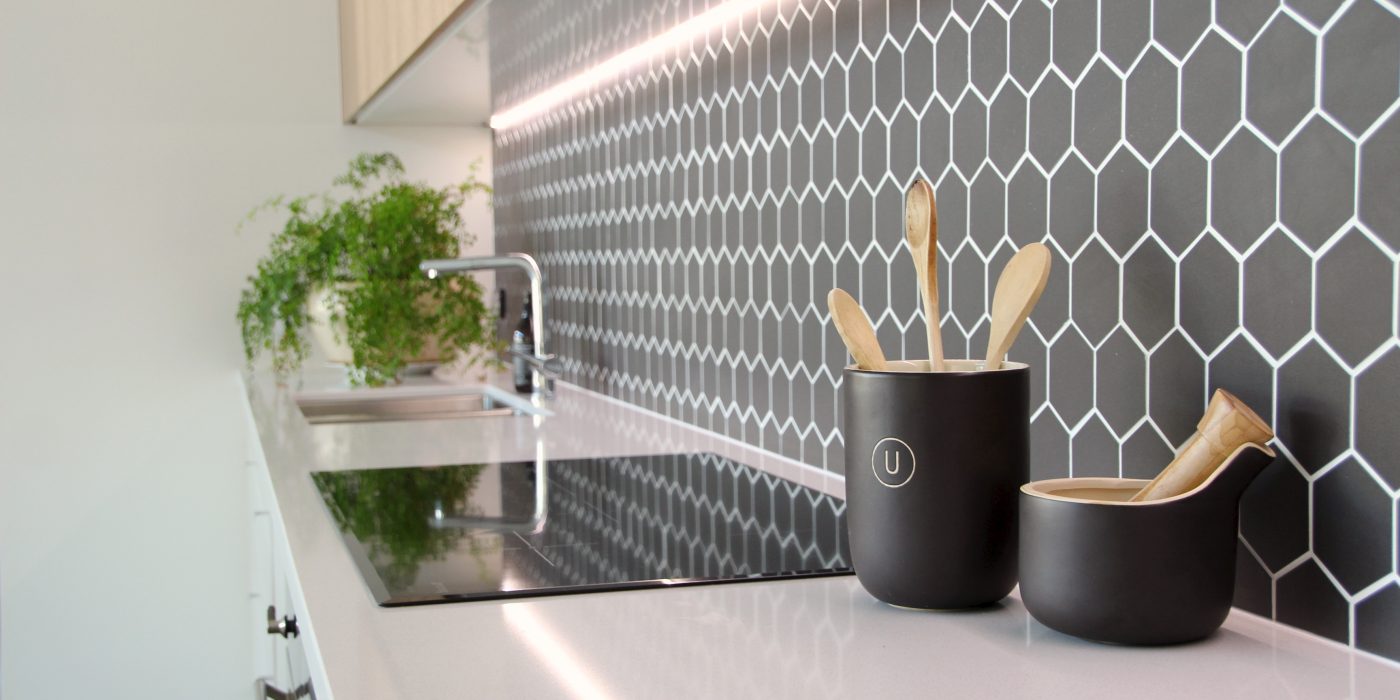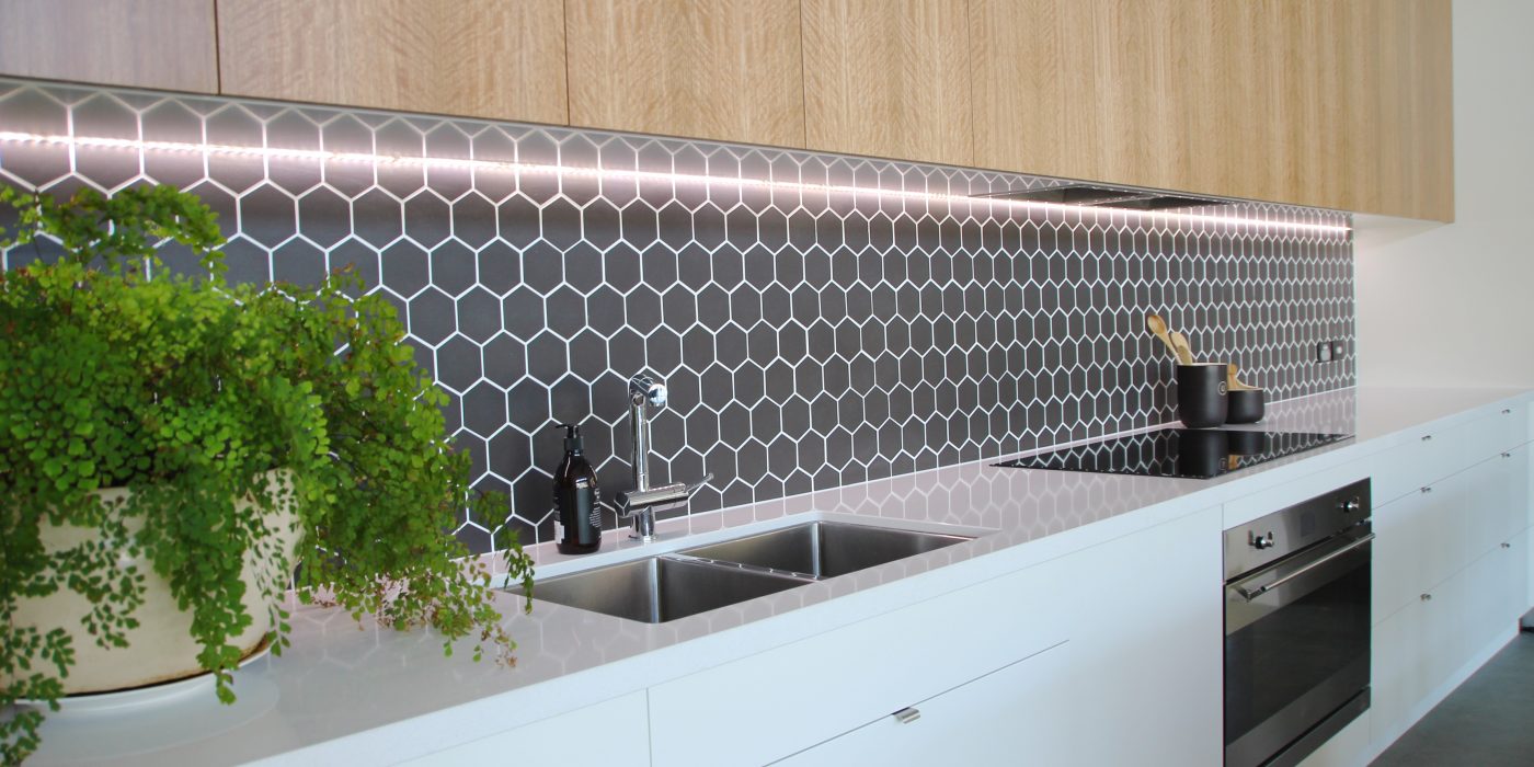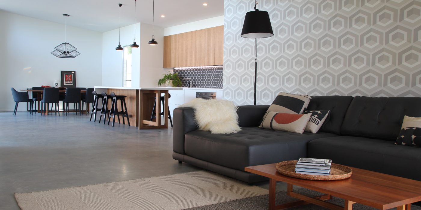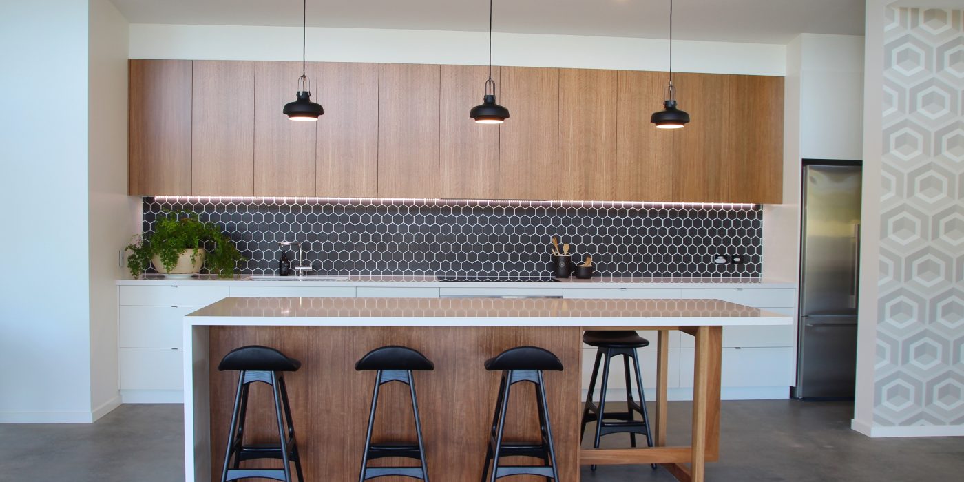This Stunning kitchen blends clean contemporary lines with a mix of natural elements and a hint of a rustic, industrial edge. This fine balance creates a timeless warmth within a modern home. The use of whites in the benchtop and cabinetry compliments the clean, seamless lines of the design and allows the timber work, burnished concrete and splashes of black to shine. The unique shape of the island bench has been designed to reflect the carefully chosen furniture pieces. It’s this fluidity between elements that demonstrates the collaboration of teams involved in this project and the results are a credit to them all.