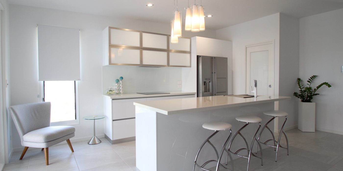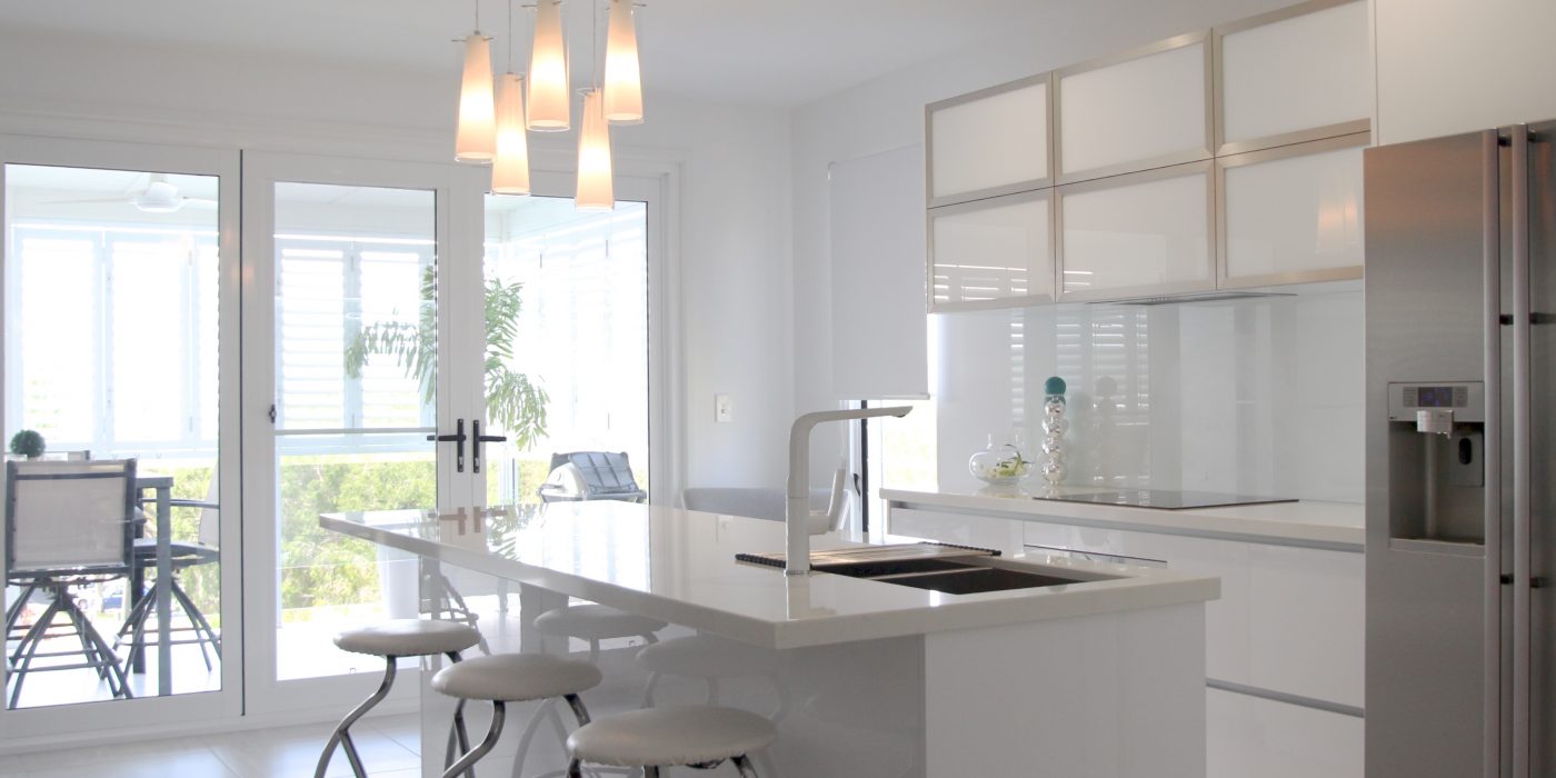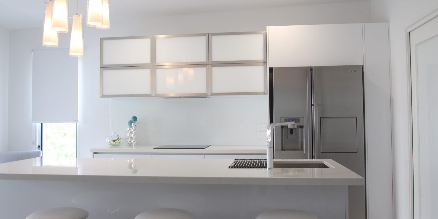 This kitchen blends the simplicity of white and stainless steel throughout all elements. Coupled with simple lines and an uncluttered handle free design as well as high gloss textures to create a modern look. The choice of Ultraglaze for the floor cabinet doors makes this space durable and easy to clean as well, a quality not always present in high gloss surfaces. The perfect choice for an easy living contemporary appeal.